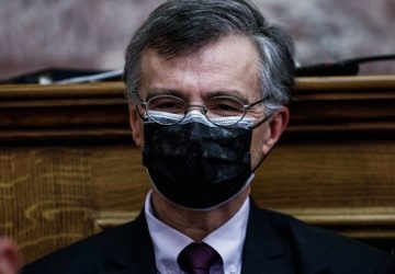 Φορώντας διπλή μάσκα, μια χειρουργική και μια υφασμάτινη, ο καθηγητής Λοιμωξιολογίας Σωτήρης Τσιόδρας, κατά τη διάρκεια της ομιλίας του στην
