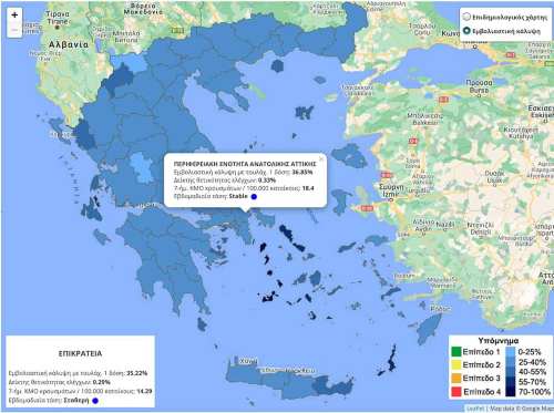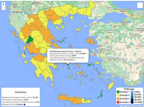 Κάνοντας «κλικ» πάνω σε κάθε περιοχή, κάθε πολίτης ή ξένος επισκέπτης μπορεί να ενημερώνεται για τον 7-ήμερο κινητό μέσο όρο κρουσμάτων ανά 100.000 κατοίκους, τον δείκτη θετικότητας (%), την εμβολιαστική κάλυψη (τουλάχιστον μία δόση) καθώς και την εβδομαδιαία τάση κρουσμάτων (ανοδική, πτωτική ή σταθερή).