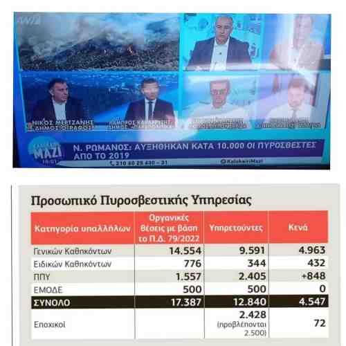 Στον παρακάτω πίνακα βλέπουμε το επίσημο προσωπικό που στελεχώνει το Πυροσβεστικό Σώμα Ελλάδας. Με λίγα λόγια ο κ. Nίκος Ρωμανός μας λέει πως μέχρι το 2019 είχαμε σύνολο περίπου 7.000 Πυροσβέστες. Ψέματα! Υπάρχουν 3630 επίσημα οργανικά κενά τα οποία ανακοίνωσε η ίδια η Νέα Δημοκρατία με ΦΕΚ πριν ένα χρόνο. Καλούμε τον κύριο Ρωμανό όπως ανασκεύασει τις δηλώσεις του και του συνιστούμε να ενημερώνει με περισσότερη ειλικρίνεια και υπευθυνότητα τους πολίτες, από την εξέχουσα θέση την οποία κατέχει.