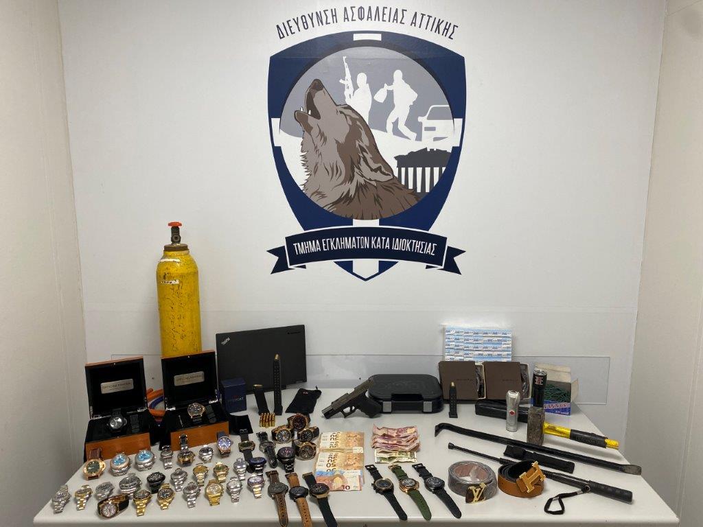 Στην κατοχή τους, καθώς και από τις έρευνες σε οικίες και χώρους, βρέθηκαν και κατασχέθηκαν φιάλη υγραερίου, ηλεκτρικά καλώδια, φυτίλια, πιστόλι, φυσίγγια, λοστοί, βαριοπούλα, μικροποσότητα κάνναβης, πλήθος ρολογιών, κινητά τηλέφωνα και κάρτες SIM .