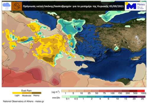 Στους χάρτες που ακολουθούν, παρουσιάζονται ο υετός (πράσινες/γαλάζιες αποχρώσεις), οι συγκεντρώσεις σκόνης (κόκκινες αποχρώσεις) και η ένταση της λασποβροχής (κίτρινες/πορτοκαλί αποχρώσεις) που αναμένονται κατά τα τις μεσημεριανές και απογευματινές ώρες της Κυριακής 05/09.