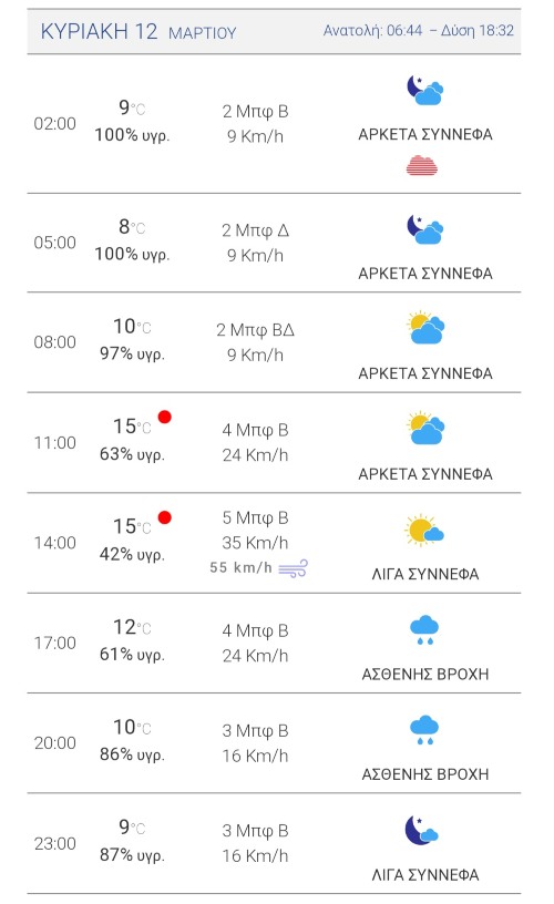 Συνεχίζεται η κακοκαιρία και την Κυριακή 12/03 σε σημαντικό μέρος της χώρας, σύμφωνα με τα τελευταία προγνωστικά δεδομένα του Εθνικού Αστεροσκοπείου Αθηνών / meteo.gr.