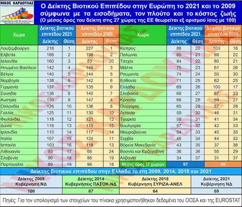 - Μέσα στα χρόνια της οικονομικής κρίσης και των μνημονίων, ο Δείκτης Βιοτικού Επιπέδου της Ελλάδας που ήταν 100 το 2009 επί κυβέρνησης ΝΔ, υποχώρησε στο 67 από το 2009 έως και το 2014 επί κυβερνήσεων ΝΔ και ΠΑΣΟΚ, υποχώρησε ακόμη περισσότερο στο 64 από το 2015 έως και το 2018 επί κυβέρνησης ΣΥΡΙΖΑ-ΑΝΕΛ και ανέβηκε στο 69 από το 2019 έως και το 2021 επί κυβέρνησης ΝΔ.