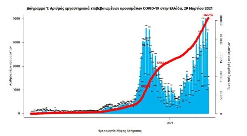 Σήμερα, Δευτέρα 29 Μαρτίου, ο Εθνικός Οργανισμός Δημόσιας Υγείας ανακοίνωσε 1.724 νέα κρούσματα, 738 ασθενείς διασωληνωμένους στις ΜΕΘ και 65 νέους θανάτους, το τελευταίο 24ωρο στην Ελλάδα.