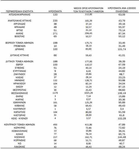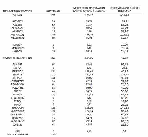 Τα κρούσματα στην Αττική άγγιξαν τα 1.631, στην Θεσσαλονίκη τα 1.179, στην Λάρισα τα 399 , στην Αχαΐα τα 271 , στη Μαγνησία τα 218 και στην Κοζάνη τα 217.