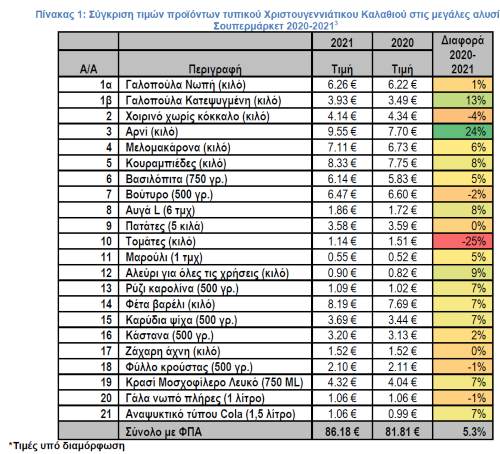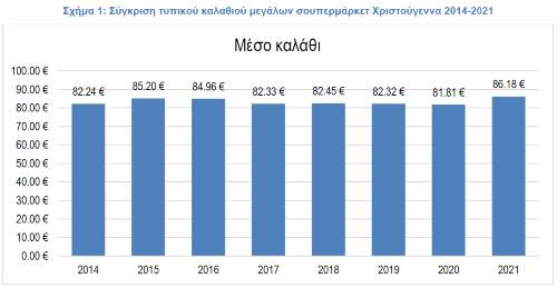 Στο σχήμα που ακολουθεί, καταγράφονται οι τιμές των προϊόντων του τυπικού Χριστουγεννιάτικου τραπεζιού στα μεγάλα σουπερμάρκετ το 2021 οι οποίες είναι αυξημένες κατά 5% κατά μέσο όρο σε σχέση με το 2020, ενώ είναι αυξημένες κατά 1% σε σχέση με την υψηλότερη τιμή που καταγράφηκε το 2015 . Συγκεκριμένα το τυπικό καλάθι υπολογίζεται σε 86,18 ευρώ το 2021 έναντι 81,81ευρώ το 2020.