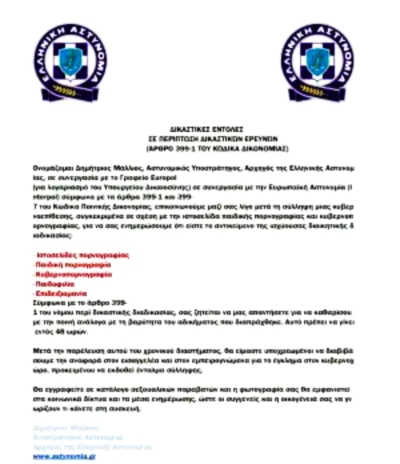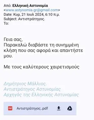Συναγερμός έχει σημάνει στην Ελληνική Αστυνομία καθώς επιτήδειοι στέλνουν email σε ανυποψίαστους πολίτες… δήθεν από τον Αρχηγό της Ελληνικής Αστυνομίας, Αντιστράτηγο Δημήτριο Μάλλιο με σκοπό να τους αποσπάσουν χρήματα!