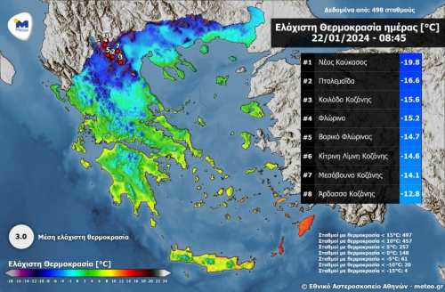 Εξαιρετικά χαμηλές θερμοκρασίες επικρατούν σήμερα σε περιοχές της Δυτικής Μακεδονίας όπου υπάρχει χιονοσκεπές έδαφος. Πιο συγκεκριμένα στο Νέο Καύκασο Φλωρίνης καταγράφηκε στις 08:10 το πρωί θερμοκρασία -19.8°C ενώ πολικές θερμοκρασίες καταγράφηκαν επίσης σε περιοχές της Πτολεμαΐδας και Κοζάνης.