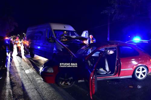 Σύμφωνα με τις argolikeseidhseis.gr το βράδυ της Κυριακής, συγκρούστηκαν πλαγιομετωπικά ένα κλειστό φορτηγό όχημα ταχυμεταφορών που κατευθυνόταν προς Άργος με ένα Ι.Χ. αυτοκίνητο με κατεύθυνση το Ναύπλιο. Από τη σύγκρουση τραυματίστηκαν πέντε άτομα, δύο από το φορτηγάκι και τρείς από το Ι.Χ.
