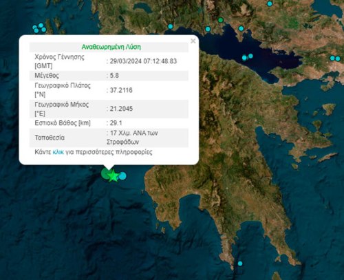 «Την 29η Μαρτίου 2024 και ώρα 09:12:48.74 είχαμε ανατολικά των Στροφάδων πολύ ισχυρή σεισμική δόνηση με μέγεθος 5.7 στην κλίμακα Richter. Πριν τον σεισμό αυτό και ώρα 09:11:54.78, δηλαδή πριν από 53.96 δευτερόλεπτο σημειώθηκε προσεισμός στην ίδια περιοχή. Το αυτόματο σύστημα εντόπισε άμεσα και σωστά την ύπαρξη δύο σεισμών και μάλιστα υπολόγισε και τα επίκεντρα στη σωστή θέση. Ωστόσο, ενώ το μέγεθος του δεύτερου ισχυρού σεισμού υπολογίστηκε σωστά, ο προσεισμός εμφανίστηκε με λάθος μέγεθος στην αυτόματη λύση.