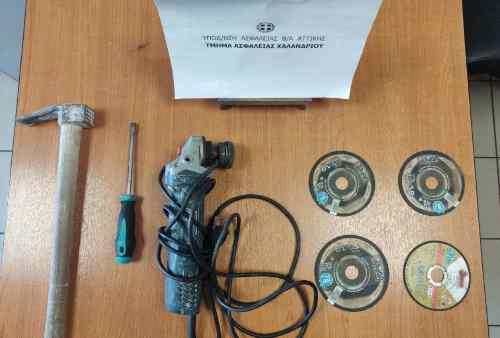 Βρέθηκαν και κατασχέθηκαν εκτός από τα κλοπιμαία και διαρρηκτικά εργαλεία (σκεπάρνι, κατσαβίδι, ηλεκτρικός τροχός με δισκάκια).