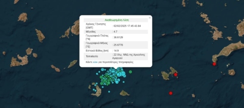 Νέος σεισμός της κλίμακας 4,7 Ρίχτερ σημειώθηκε στις 19:45 στη Σαντορίνη με εστιακό βάθος στα 13,5 χιλιόμετρα και επίκεντρό νότια της Αρκεσίνης Αμοργού. Σημειώνεται 4 λεπτά πριν είχε προηγηθεί σεισμός της κλίμακας 4,5 Ρίχτερ στις 19:41 σχεδόν στο ίδιο σημείο.