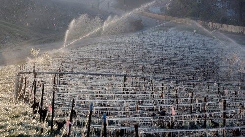 Ο τρίτος, είναι να ψεκάζουν με νερό πάνω από τα αμπέλια με σκοπό τη διατήρηση της θερμοκρασίας και την προστασία από τον πάγο.