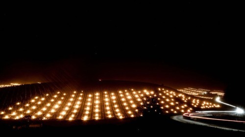 Έξω από το Chablis, γνωστό σε όλο τον κόσμο για το φρουτώδες, όξινο λευκό κρασί του, βγαίνει μια βαθιά πορτοκαλί λάμψη από δεκάδες χιλιάδες κεριά κρεμασμένα πάνω από τους αμπελώνες τις πρώτες πρωινές ώρες.