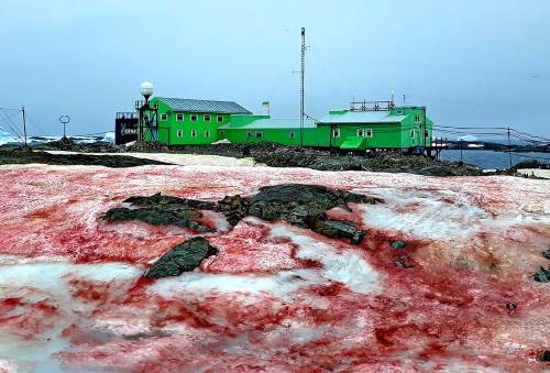 Στα πόδια του, λωρίδες κόκκινου χιονιού λαμπυρίζουν στο φως του ήλιου.Η άλγη είχε περιγραφεί για πρώτη φορά τον τρίτο αιώνα π.Χ. από τον Αριστοτέλη. Όμως ταυτοποιήθηκε επισήμως μόλις το 2019 και της δόθηκε η λατινική ονομασία Sanguina nivaloides.