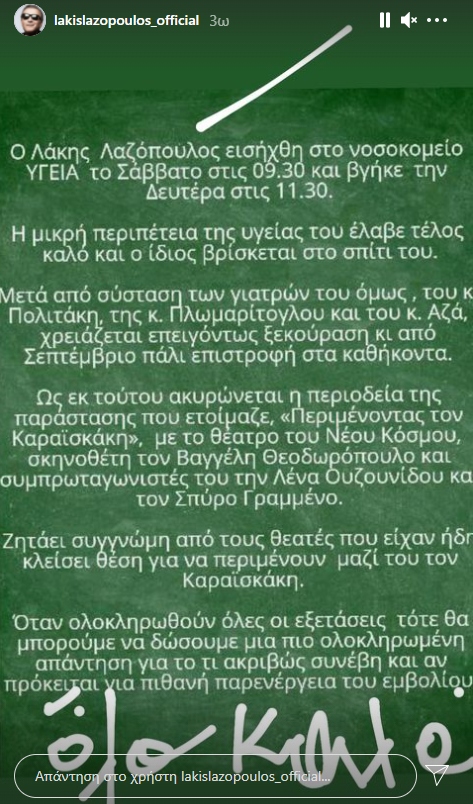 Συγκεκριμένα, αναφέρεται ότι η περιπέτεια της υγείας του είχε αίσιο τέλος, με τον ίδιο να βρίσκεται στο σπίτι του και να αναρρώνει. Μετά από σύσταση των γιατρών του, ο Λάκης Λαζόπουλος θα χρειαστεί ένα διάστημα ξεκούρασης και έτσι ακυρώνεται η περιοδεία της παράστασης ” Περιμένοντας τον Καραϊσκάκη” και θα επιστρέψει στις υποχρεώσεις του, τον Σεπτέμβρη.