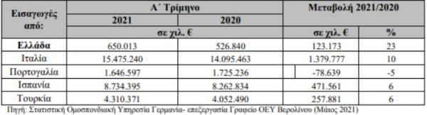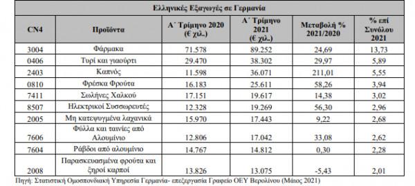 Σημαντική αύξηση κατά 23,37% κατέγραψαν οι ελληνικές εξαγωγές προς τη Γερμανία το α’ τρίμηνο του 2021 συγκριτικά με το αντίστοιχο περσινό διάστημα, φθάνοντας τα 650 εκατ. ευρώ.