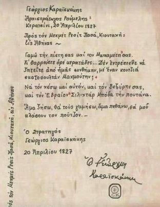 Ο Γεώργιος Καραϊσκάκης, στρατηγός πια, στέλνει επιστολή προς τον Κιουταχή, με ημερομηνία 20 Απριλίου 1827.