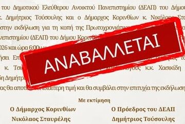 Ανακοινώνεται ότι η 8η Επιστημονική Διάλεξη του Δημοτικού Ελεύθερου Ανοιχτού Πανεπιστημίου (ΔΕΑΠ) του Δήμου Κορινθίων, η οποία ήταν προγραμματισμένη για