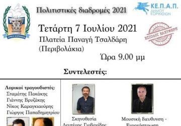 Το πρόγραμμα των «πολιτιστικών διαδρομών 2021» του δήμου Κορινθίων και του ΚΕΠΑΠ συνεχίζεται σήμερα Τετάρτη 7 Ιουλίου 2021. Στην πλατεία