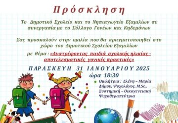 Αναβάλλεται η προγραμματισμένη ομιλία της ψυχολόγου, Ελένης – Μαρίας Δήμου στο Δημοτικό και στο Νηπιαγωγείο Εξαμιλίων με θέμα “Ανατρέφοντας παιδιά