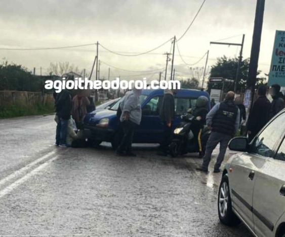 Το δεύτερο τροχαίο σύμφωνα με το agioitheodoroi.com σημειώθηκε στους Αγίους Θεοδώρους όταν ένα αυτοκίνητο που βγήκε από κάθετο δρόμο που οδηγεί στην ΠΕΟΑΚ παρέσυρε μία γυναίκα η οποία διέσχιζε πεζή τον δρόμο και την τραυμάτισε ευτυχώς ελαφρά.