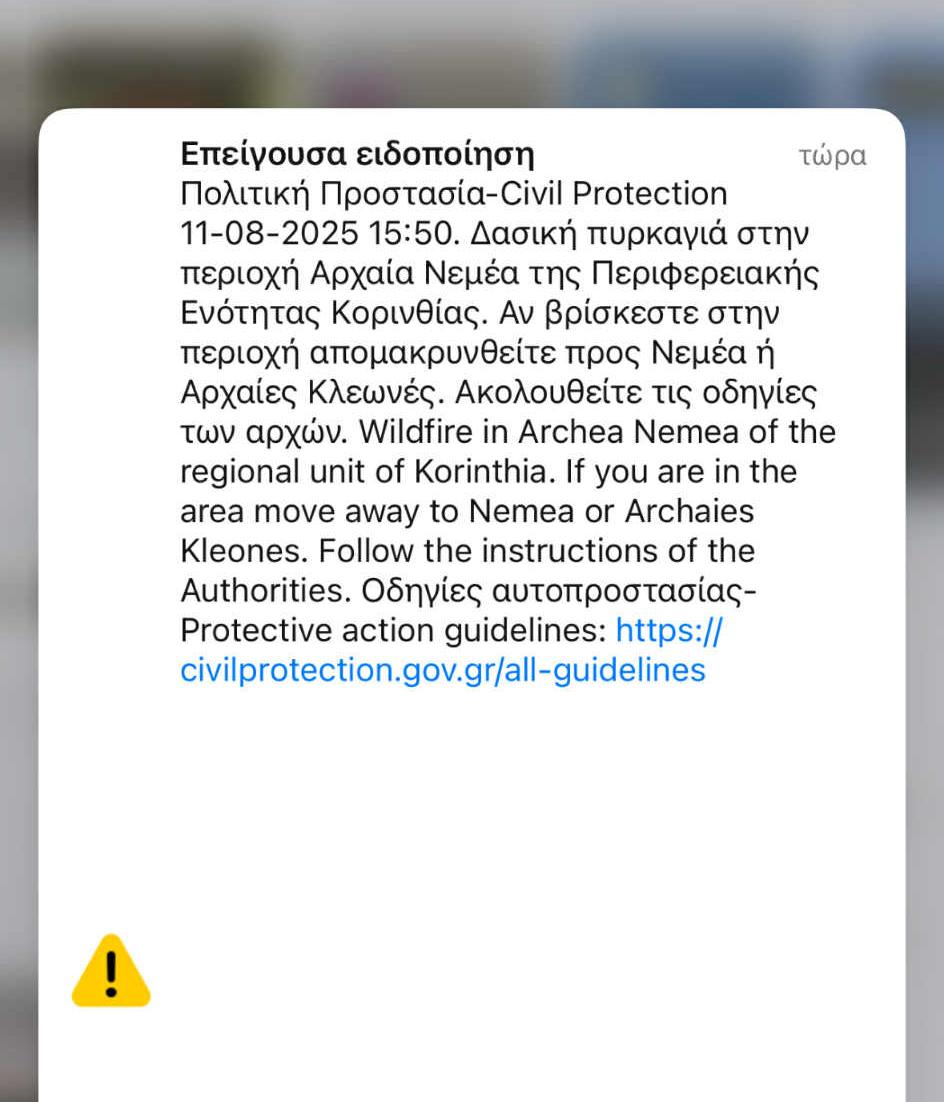 Λίγο πριν τις 16:00, εστάλη μήνυμα του 112 για άμεση εκκένωση προς Νεμέα ή Αρχαίες Κλεωνές.