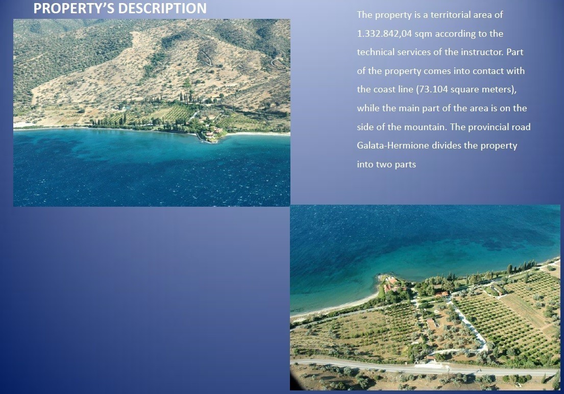 Πρόκειται για ένα ακίνητο επιφάνειας 1.332 στρεμμάτων, κοντά στο 20ο χιλιόμετρο της επαρχιακής οδού Ερμιόνης – Γαλατά και απέχει περίπου 20 λεπτά από την Ερμιόνη ενώ «βλέπει» στην Ύδρα.