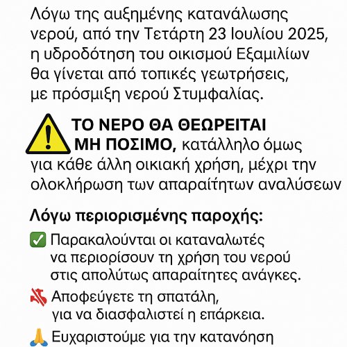 “Λόγω της αυξημένης κατανάλωσης νερού, από την Τετάρτη 23 Ιουλίου 2025, η υδροδότηση του οικισμού Εξαμιλίων θα γίνεται από τοπικές γεωτρήσεις, με πρόσμιξη νερού Στυμφαλίας. Το νερό θα θεωρείται ΜΗ ΠΟΣΙΜΟ, κατάλληλο όμως για κάθε άλλη οικιακή χρήση, μέχρι την ολοκλήρωση των απαραίτητων αναλύσεων. Παρακαλούνται οι καταναλωτές να περιορίσουν τη χρήση του νερού στις απολύτως απαραίτητες ανάγκες. Αποφεύγετε τη σπατάλη, για να διασφαλιστεί η επάρκεια. Ευχαριστούμε για την κατανόηση και τη συνεργασία σας.”