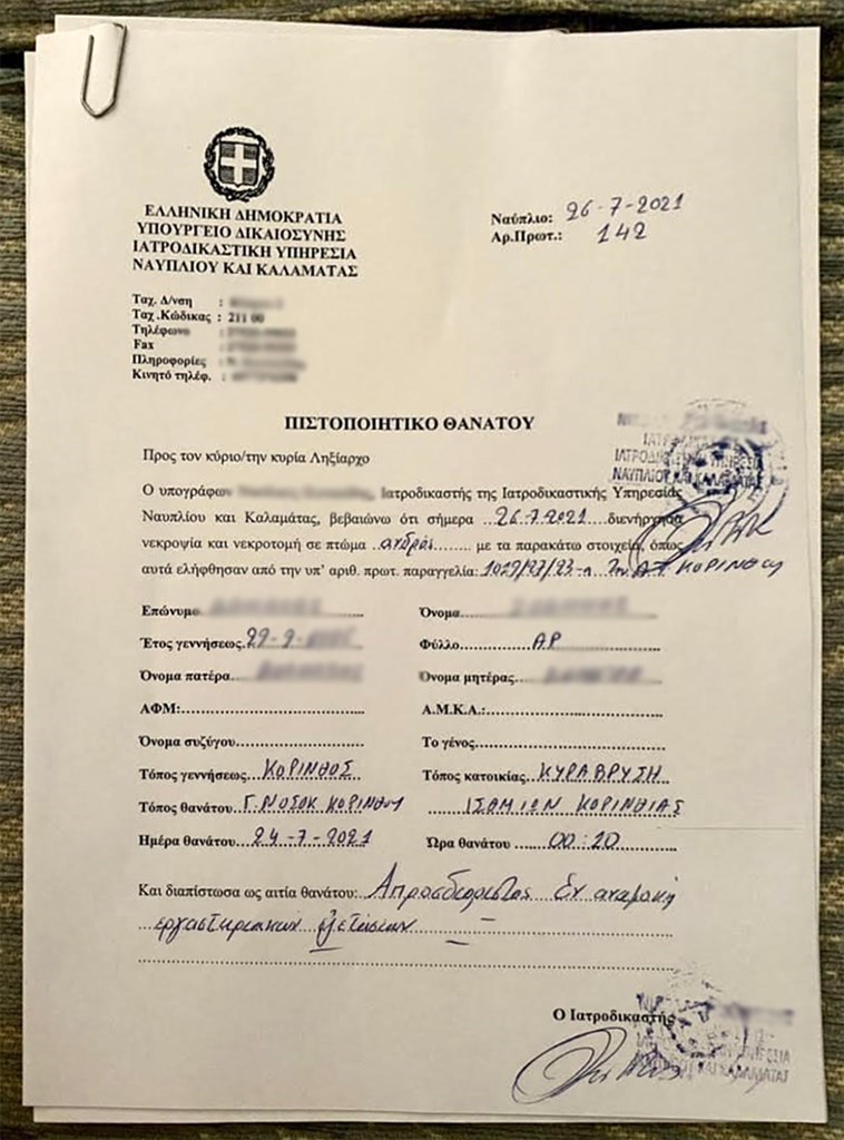 »Παρά τις επίμονες και έντονες προσπάθειες των Ιατρών και του Νοσηλευτικού προσωπικού, δυστυχώς κατέληξε και να καταστήσουμε γνωστό ότι ο ανωτέρω λόγω και της διάπλασής του και του βάρους του και της υποξαιμίας του δεν κατόρθωσε να αντεπεξέλθει στη ασθένειά του από Covid-19, όπως προαναφέρεται.
