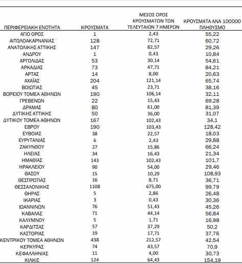 Σημειώνεται ότι η Κορινθία παρουσίασε σημαντική αύξηση, σε σχέση με τις προηγούμενες ημέρες αγγίζοντας τα 68.