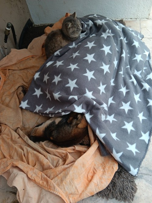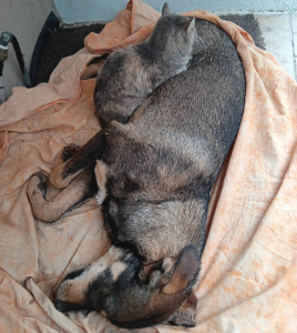Μία μικρή γατούλα, μόλις το σκυλάκι μεταφέρθηκε σε ζεστό σημείο, έτρεξε κοντά του σαν «νοσοκόμα»… κουλουριάστηκε πάνω στο τραυματισμένο σώμα του και δεν το εγκατέλειψε ούτε στιγμή. Έμεινε εκεί, ακούνητη, για να το ζεστάνει και να το παρηγορήσει.