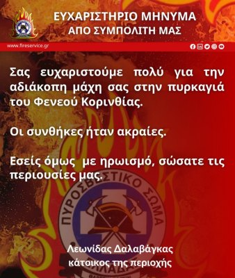 Ο κ. Λεωνίδας Δαλαβάγκας, κάτοικος της περιοχής εξέφρασε δημόσια την ευγνωμοσύνη του για την αδιάκοπη μάχη που έδωσαν οι πυροσβέστες με στόχο να περιορίσουν τη φωτιά και να προστατέψουν ζωές και περιουσίες.