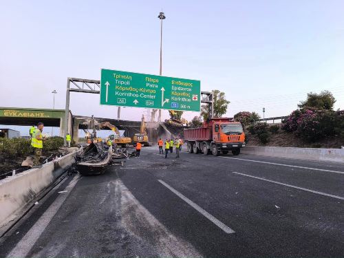 Με το πρώτο φως της ημέρας ξεκίνησαν οι εργασίες κατεδάφισης, της αερογέφυρας κάτω από την οποία εξετράπη και άρπαξε φωτιά το βυτιοφόρο καυσίμων. Η αερογέφυρα υπέστη σοβαρές ζημιές από τις υψηλές θερμοκρασίες που αναπτύχθηκαν και έπειτα από αυτοψία που πραγματοποίησε το κλιμάκιο των μηχανικών του Υπουργείου Υποδομών και Μεταφορών που συνόδευαν τον υφυπουργό, κ. Νίκο Ταχιάο, πάρθηκε η απόφαση.