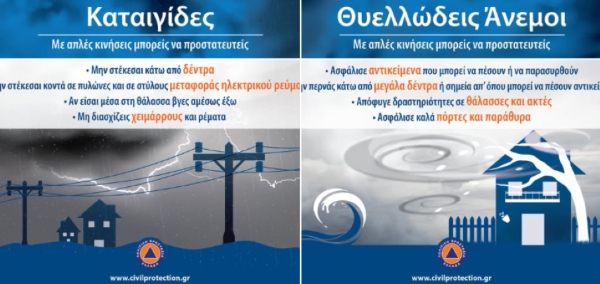 Συνιστά στους πολίτες να είναι ιδιαίτερα προσεκτικοί, μεριμνώντας για τη λήψη μέτρων αυτοπροστασίας από κινδύνους που προέρχονται από την εκδήλωση των έντονων καιρικών φαινομένων.
