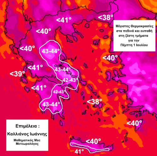 Συγκεκριμένα, ο μετεωρολόγος Γιάννης Καλλιάνος με ανάρτησή του στο facebook, προειδοποιεί ότι αύριο Πέμπτη 1 Ιουλίου θα είναι μια πολύ δύσκολη μέρα για τις περισσότερες περιοχές της χώρας και θα την θυμόμαστε για πολύ καιρό λόγω και της αυξημένης δυσφορίας και τις βραδινές ώρες ειδικά στις μεγαλουπόλεις. Μάλιστα, επιμένει για κάποια συγκεκριμένα τμήματα της επικράτειας όπου εκεί ο υδράργυρος θα ξεπεράσει και τους 42°C και πιθανότατα να φτάσει τους 43°C και ίσως πολύ τοπικά και τους 44°C.