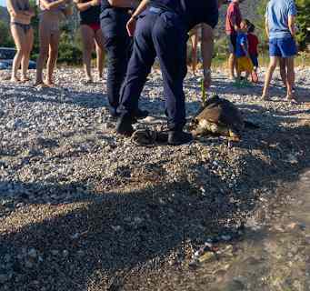 Αμέσως λουόμενοι που είδαν την σκηνή ειδοποίησαν το Λιμενικό και με την βοήθεια κάποιου ντόπιου ψαρά, την έβγαλαν στη παραλία. Η χελώνα ήταν μπλεγμένη σε κάποιο παραγάδι και δεν μπορούσε να κινηθεί φυσιολογικά, προφανώς κάποιο σκάφος με προπέλα την χτύπησε και έκοψε σχεδόν σε όλο το μήκος του, το καβούκι της.