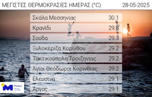 Πρώτη σε θερμοκρασία πανελλαδικά ήταν η Σκάλα Μεσσηνίας με 30,1°C, ενώ ακολούθησαν το Κρανίδι (29,8°C) και η Σούδα (29,3°C).