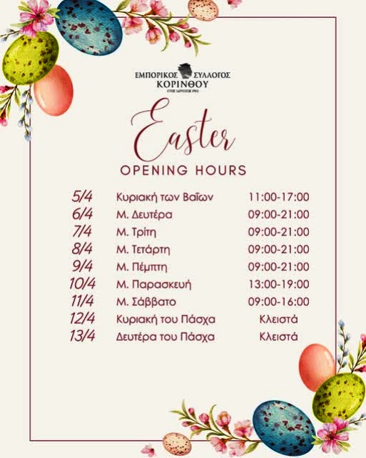 Οι Κορίνθιοι και οι επισκέπτες της πόλης έχουν την ευκαιρία να απολαύσουν τα ψώνια τους αύριο (5/4), καθώς τα εμπορικά καταστήματα θα λειτουργούν από τις 11 το πρωί έως τις 5 το απόγευμα.