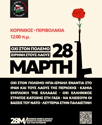 Ένα ευρύ αντιπολεμικό μήνυμα στέλνει η Συλλογική Δράση για την Παλαιστίνη Ν. Κορινθίας, καλώντας τους πολίτες σε συγκέντρωση αύριο, Σάββατο (28/3) στις 12:00 στα Περιβολάκια, στην Κόρινθο.