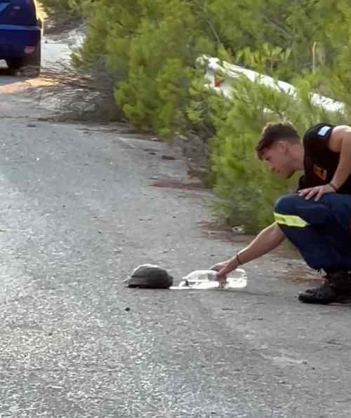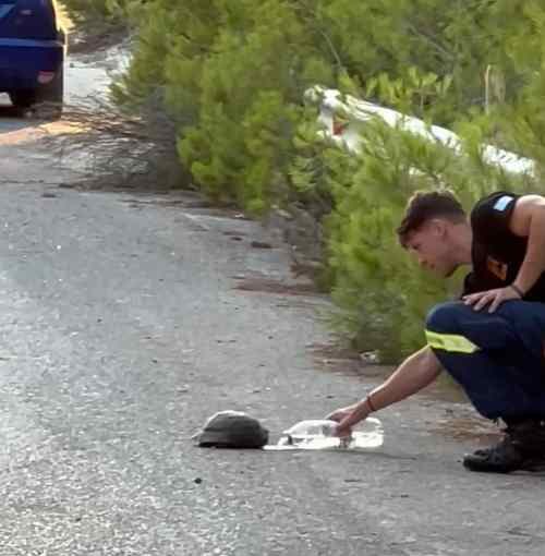 Οι όμορφοι άνθρωποι, όμορφα φέρονται… αυτό απέδειξαν οι πυροσβέστες που επιχείρησαν στην φωτιά Λουτρακίου και συγκεκριμένα στον οικισμό του Αγίου Χαράλαμπου, οι οποίοι παρά την κούραση και την εξάντλησή τους έπειτα από μία δύσκολη νύχτα μέσα στις φλόγες, όταν ξημερώματα πια… είδαν μία χελώνα να κινείται στην καυτή άσφαλτο, έσπευσαν να την δροσίσουν.
