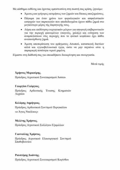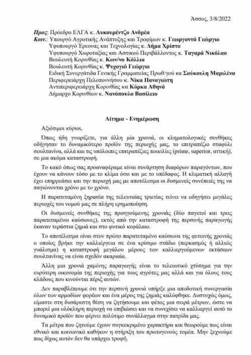 Υπενθυμίζουμε ότι έχει σταλεί από Υφυπουργούς, Βουλευτές, Περιφερειάρχη, Αντιπεριφερειάρχη και Δήμαρχο του τόπου μας επιστολή προς τον Πρόεδρο του ΕΛΓΑ, Λυκουρέντζο Ανδρέα επιστολή για στήριξη του πρωτογενούς τομέα.