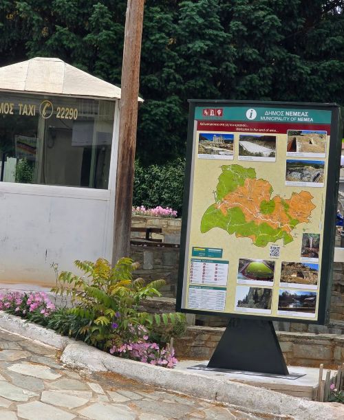Μια σύγχρονη, αυτοφωτιζόμενη πινακίδα τουριστικού ενδιαφέροντος τοποθετήθηκε απέναντι από το Μουσείο της Αρχαίας Νεμέας, προσφέροντας στους επισκέπτες χάρτη και πληροφορίες για τα αξιοθέατα της περιοχής. Παρόμοια πινακίδα τοποθετήθηκε και στην πλατεία Ταξί, στο κέντρο της πόλης, ενισχύοντας τον τουριστικό προσανατολισμό της Νεμέας.