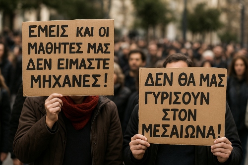 Οι ίδιοι μιλούν για μια «επιστροφή στον Μεσαίωνα»· όχι με σχήματα λόγου, αλλά με την αγωνία που κουβαλούν καθημερινά μέσα στις τάξεις τους. «Δεν είμαστε μηχανές, ούτε εμείς ούτε οι μαθητές μας», λένε χαρακτηριστικά, υπενθυμίζοντας ότι η εκπαίδευση δεν μπορεί να γίνει με ανθρώπους εξουθενωμένους.