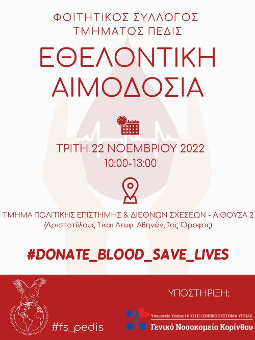 Η αιμοδοσία θα πραγματοποιηθεί στο Τμήμα Πολιτικής Επιστήμης & Διεθνών Σχέσεων στην Κόρινθο (Αριστοτέλους 1 & Λεωφ Αθηνών, 1ος
