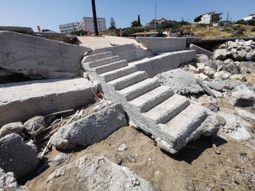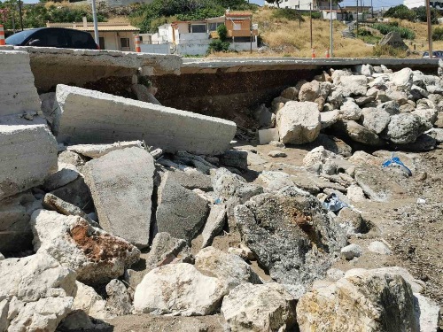 Τα μπάζα απλώνονται ανεξέλεγκτα, ενώ η διάβρωση έχει φτάσει σε τέτοιο σημείο που καθιστά το πεζοδρόμιο ανασφαλές, με τμήματα να καταρρέουν προϊδεάζοντας για σοβαρό ατύχημα.