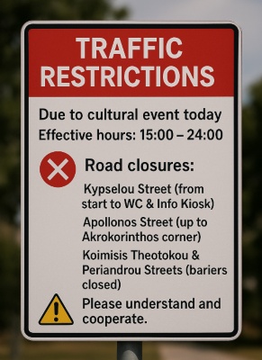 Λόγω της αποψινής πολιτιστικής εκδήλωσης που θα πραγματοποιηθεί στις 21:00 στον Αρχαιολογικό Χώρο της Αρχαίας Κορίνθου, η Πρόεδρος της Κοινότητας κ. Ευτέρπη Καλαμπαλίκη ενημερώνει το κοινό ότι θα εφαρμοστούν ειδικές κυκλοφοριακές ρυθμίσεις για την ασφάλεια και την ομαλή διεξαγωγή της διοργάνωσης.