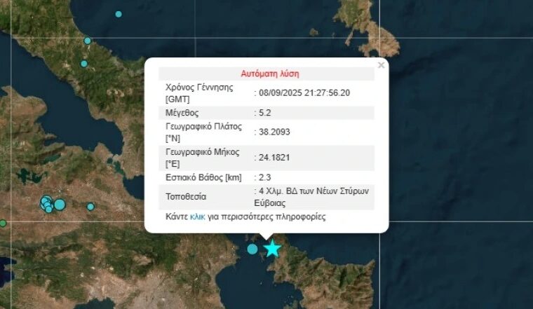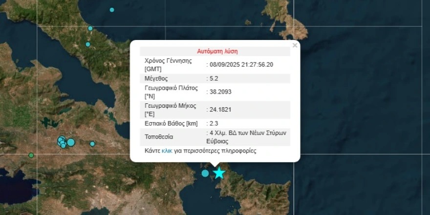 Συγκεκριμένα, ο σεισμός σημειώθηκε λίγο πριν τις 12:30 το βράδυ, με μέγεθος 5,2 Ρίχτερ σύμφωνα με την πρώτη καταγραφή του Γεωδυναμικού Ινστιτούτου. Το επίκεντρο εντοπίζεται στον θαλάσσιο χώρο, 4 χιλιόμετρα νοτιοδυτικά των Νέων Στύρων Ευβοίας, ενώ το εστιακό βάθος υπολογίζεται στα 2,3 χιλιόμετρα.