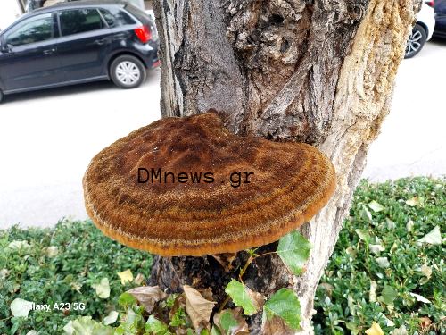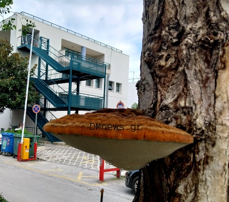 Αν περπατήσετε αυτές τις μέρες στην οδό Κολιάτσου, έξω από το Δημαρχείο Κορίνθου, μπορεί να δείτε κάτι που μοιάζει με σκηνή από ντοκιμαντέρ του National Geographic… ένα τεράστιο μανιτάρι που ξεπροβάλλει από τον κορμό ενός δέντρου στο διάζωμα!