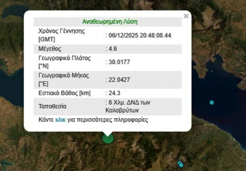 Η Κόρινθος και πολλές πόλεις της Πελοποννήσου «χόρεψαν» στον ρυθμό των 4,6 Ρίχτερ που «χτύπησαν» κοντά στα Καλάβρυτα. Σύμφωνα με το Γεωδυναμικό Ινστιτούτο, το επίκεντρο εντοπίζεται 6 χλμ. δυτικά – νοτιοδυτικά των Καλαβρύτων, με εστιακό βάθος 24,3 χιλιόμετρα.